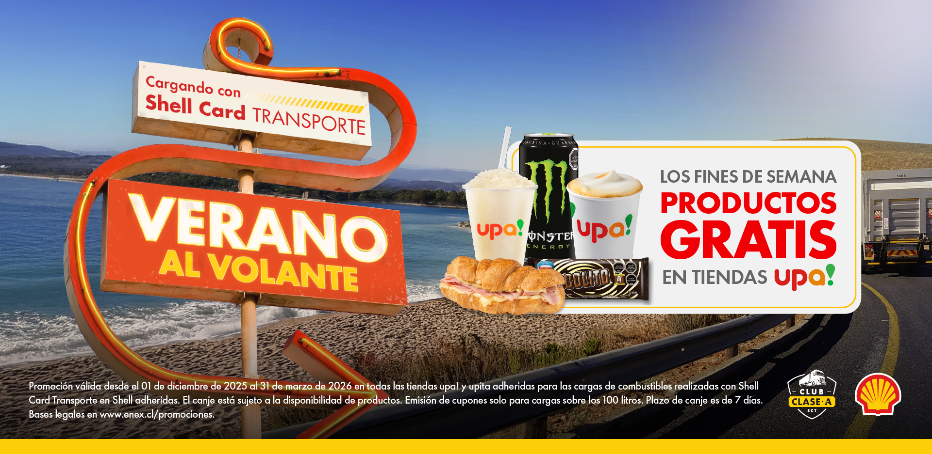 Este verano Club Clase A y Shell Card Transporte sorprende a los conductores de camiones. Por cada carga de combustible realizada los fines de semanas, puedes elegir 1 producto gratis en tiendas upa! en ese mismo momento o el día que prefieras de la semana.